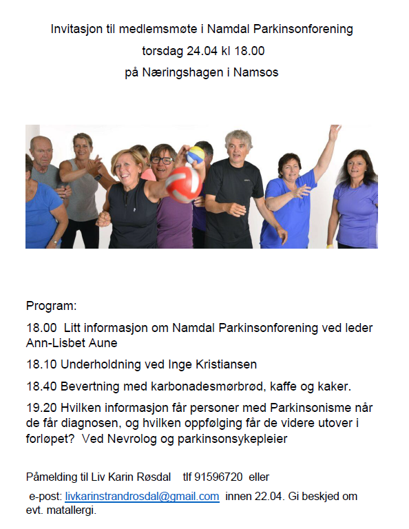 Torsdag den 24.04 var det medlemsmøte på Næringshagen i Namsos med bortimot 30 deltakere, både personer med Parkinsonisme og familiemedlemmer.