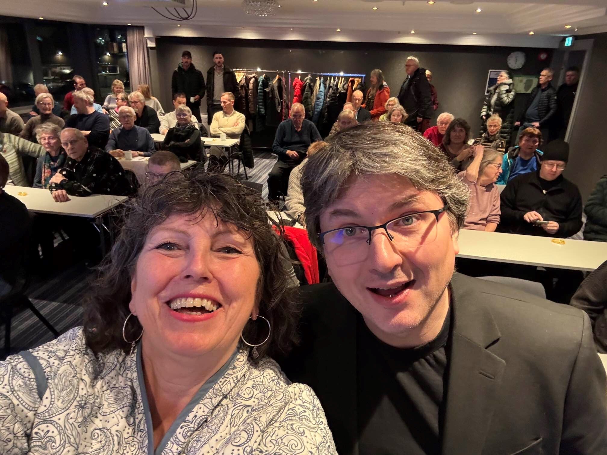 Generalsekretær Kristin Ruud og professor Charalampos «Haris» Tzoulis presenterte forbundet og norsk parkinsonforskning under et åpent møte i Tromsø.