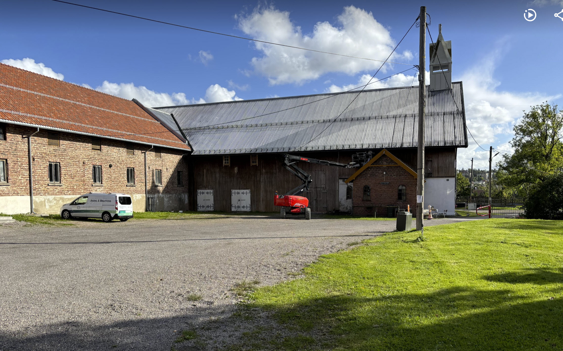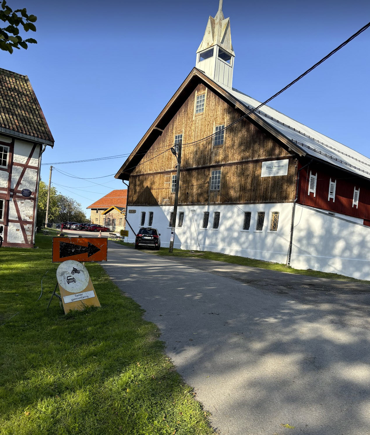 Dersom bommen inn til gårdsplssen lukket, må du følge pila til høyre og kjøre helt rund den store låven