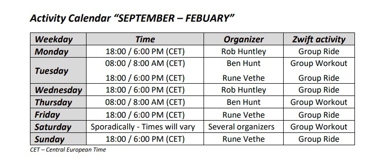 Det tilbys digitale treninger på Zwift hver dag gjennom hele året, og de fleste av treningene er på tidspunkt som passer for ulike tidssoner slik at det så å si er tidsuavhengig å delta på trening.