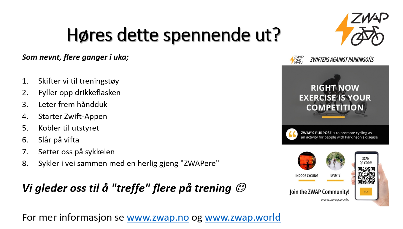 Sykkelklubben ZWAP «Zwifters Against Parkinson’s» Sykkelklubben ZWAP hadde sin begynnelse i pandemitiden og ble registrert som klubb i Brønnøysundregisteret i januar 2023. ZWAP sitt formål er å fremme sykling som aktivitet for personer med Parkinson, samt bidra til å skape oppmerksomhet om og skaffe veldedige midler til kampen mot Parkinson. Formålet skal oppnås gjennom følgende aktiviteter Arrangere sykkeltreninger på Zwift eller tilsvarende andre digitale plattformer Arrangere sykkelturer/-løp som skaper oppmerksomhet og grunnlag for sponsorer Tilrettelegge informasjon om digitalt støttet sykling som treningsaktivitet for personer med Parkinson Tilrettelegge et opplegg for innsamling av veldedige midler i forbindelse med ovennevnte Innendørs sykling […]