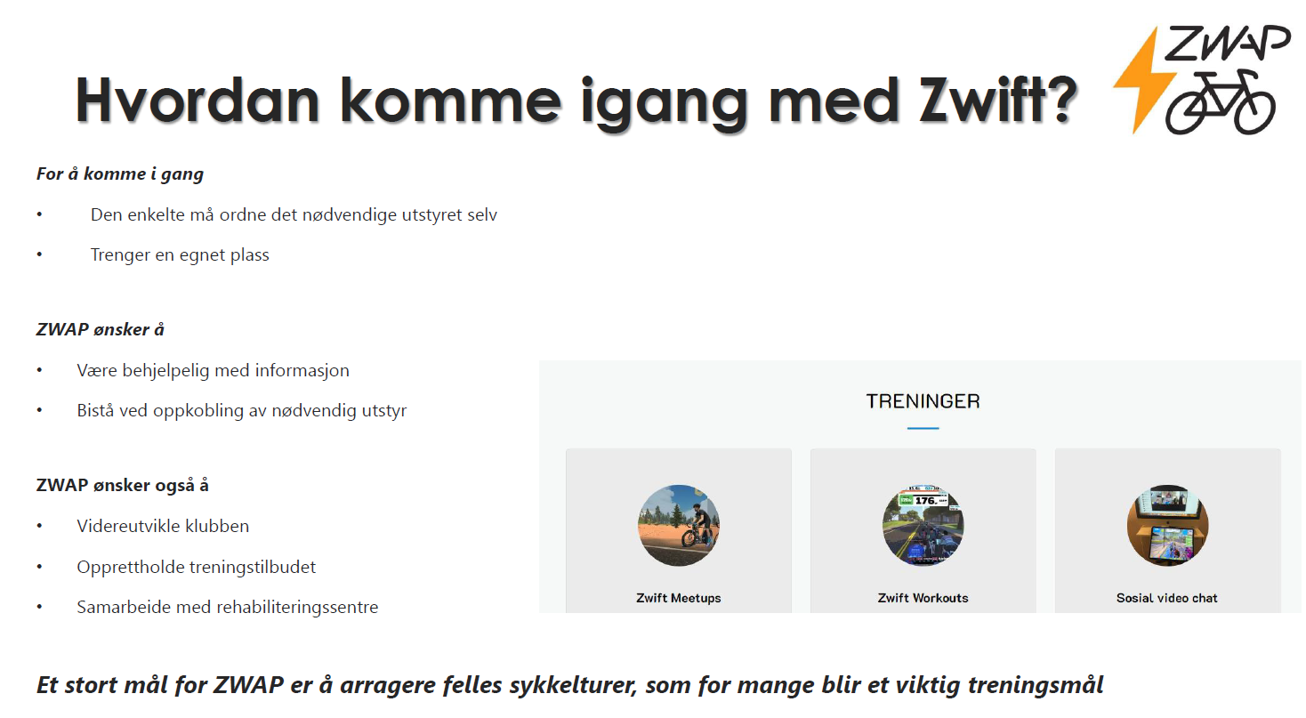 - «ZWAP sykkelstudio» – legge til rette for å samles fysisk til ZWAP-trening – også med tanke på de som ikke har plass til sykkelrulle / sykkel på passende sted hjemme